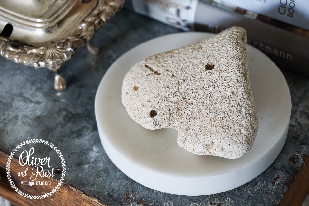 A heart shaped keep sake from one of our trips years ago. It always sits on our dresser and I used a marble soap dish to elevate it a bit. One of those things that just looks like a rock but its a special piece to us
