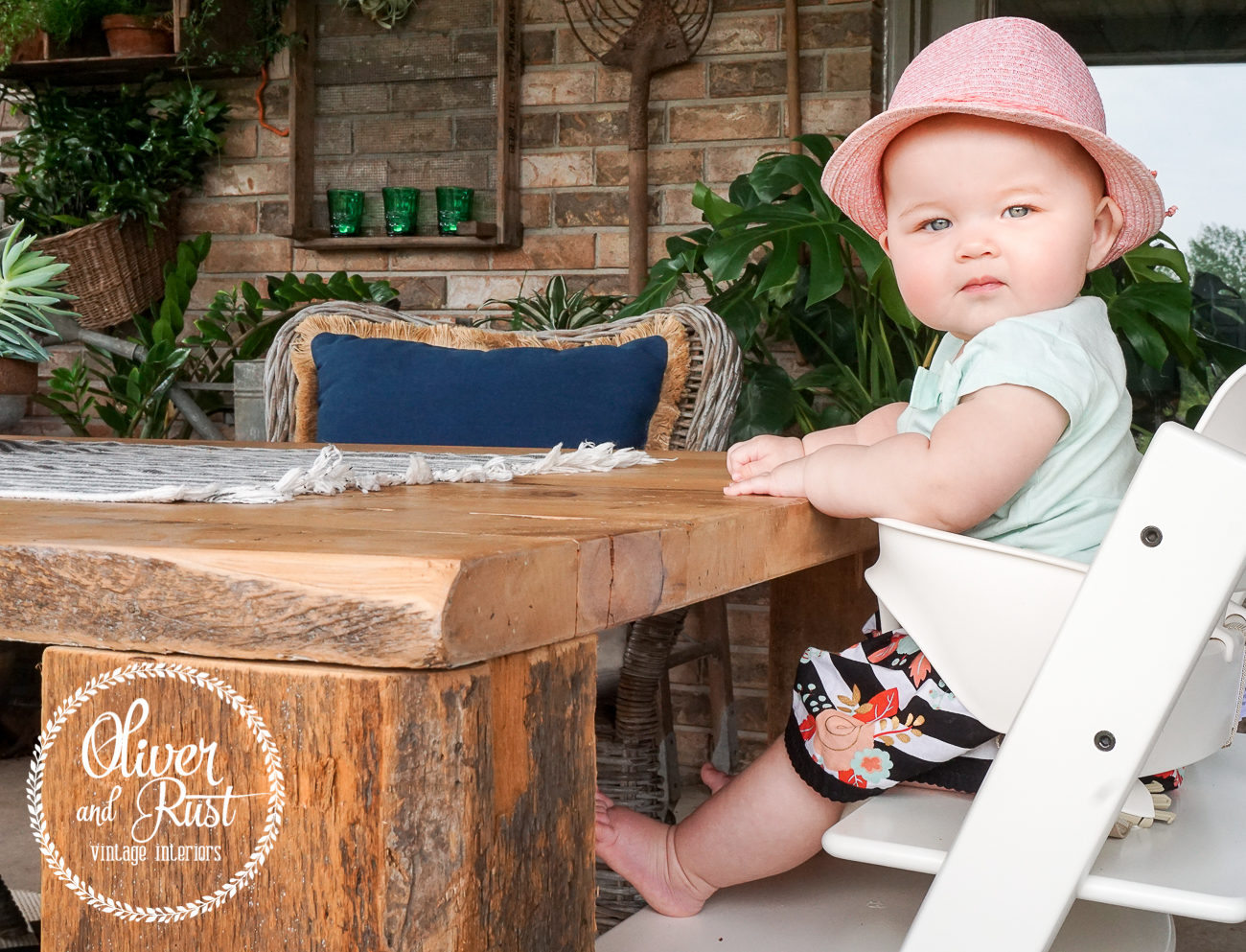 there is a chair missing because almost all of the time there is a cute little high chair with a mini me sitting in it. i could have brought the 6th chair out for the photos and styled it all up so you thought that chair was always out here but the reality of it is this year, that's just not the case. we bought the stokke tripp trapp high chair after reading all the reviews for different chairs. i wanted something that would look nice with our home not willing to compromise on huge amounts of style but i also wanted a chair we could pull up to the table so Emma learns to eat with us and not in the corner on her own. this may not work for everyone but it is working great for us. she sits with us at the table during dinner and won't know any different. we have busy lives and that little peanut gets carted around with us everywhere so we want her to be able to adjust to sitting with the "big people" just as easily as in her play areas.
