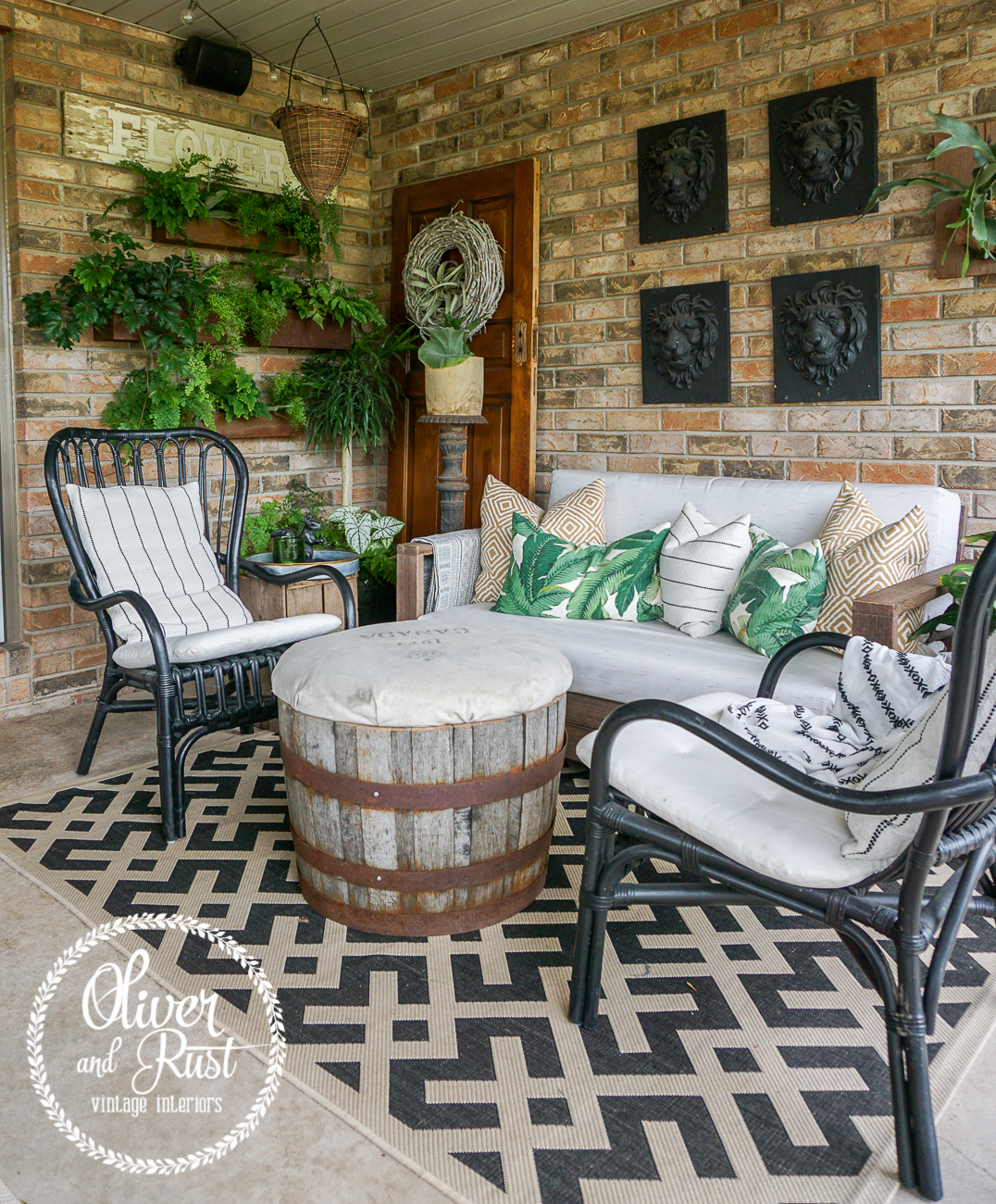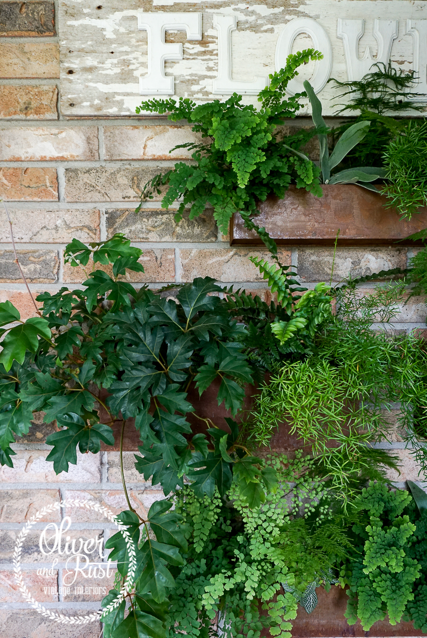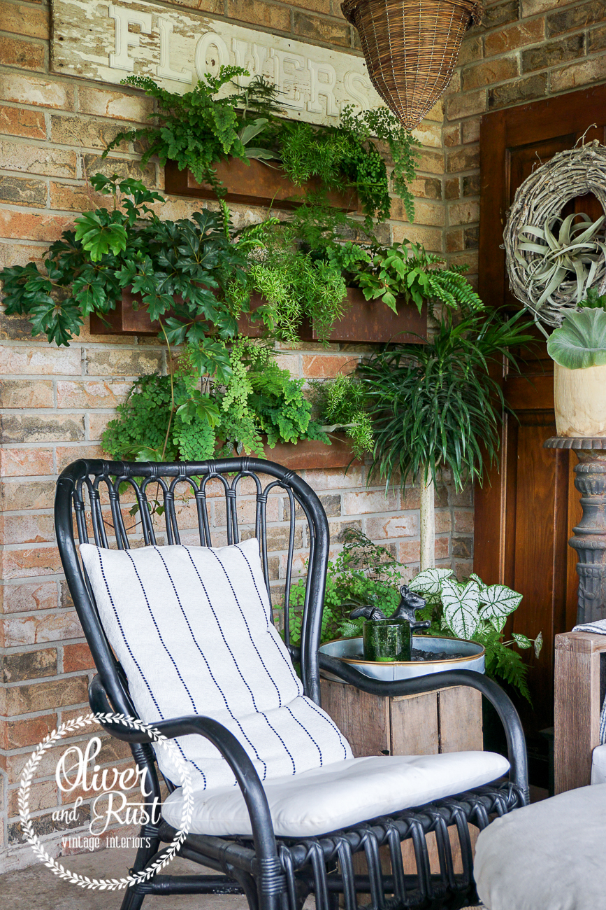 the third and final notable change on this patio this year was we removed the potting bench dresser thing that stood in this area under the flowers sign. it was bulky and deep and took up a lot of space to just hold pots. nothing against potting benches as i love them and moved this one on to my front porch but this patio just needed the breathing room. i had Trevor hang 4 rectangle metal planters on the wall and i loaded them with greenery. it looks high maintenance but in actuality it is beyond low maintenance. i water them 3 times a week and with the humidity they just keep growing. no muss no fuss. my motto today apparently.