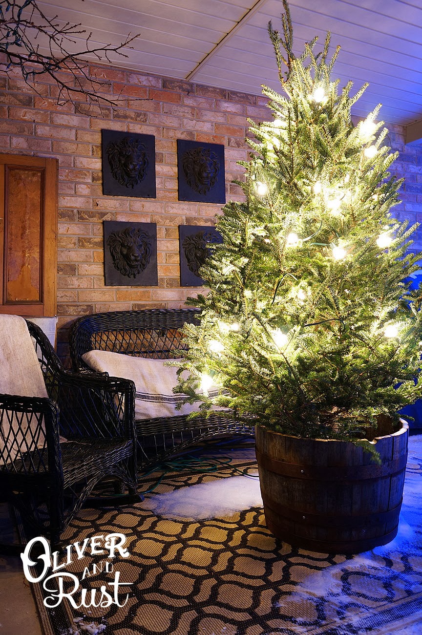our patio need a little something to see through the back door when you come in the house. i took the top off our wine barrel ottoman and plopped a tree inside. i picked up a stand and some light strings at the thrift store to make this a lovely glowing display