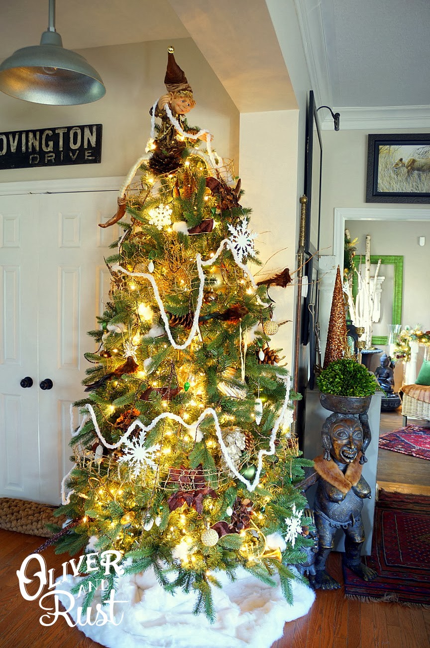 our main tree is artificial and was purchased last year from tree classics when the duct tape wasn't holding the top on our old one anymore. this tree carries the brown, white and green with natural vintage touches and graces the corner near our laundry room. our court jester continues to hold court on top holding his piece of the crocheted garland i made last year