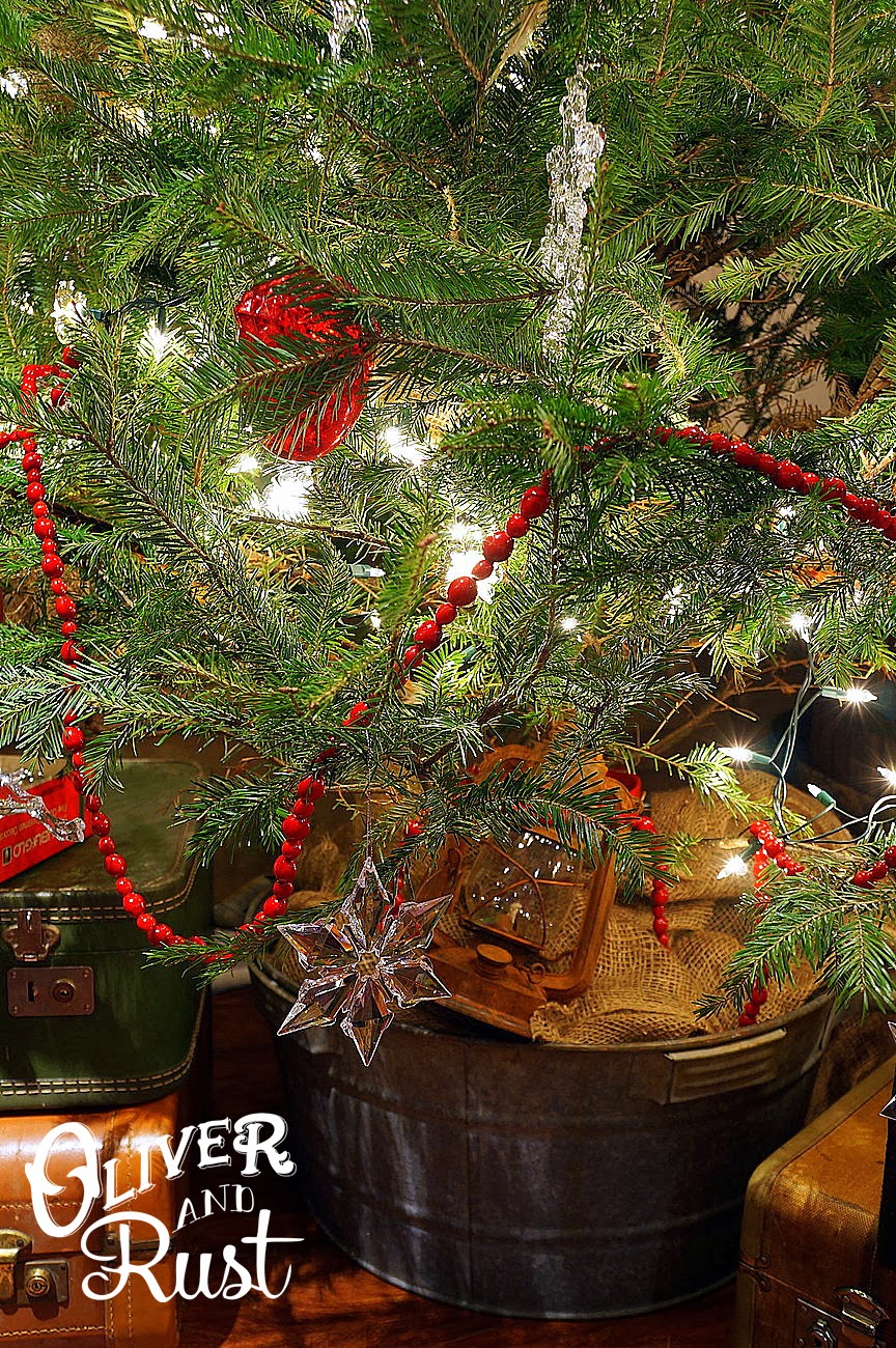 i may not embrace red in the upstairs parts of our house but i love it in the basement. our real tree is a balsam fir this year and smells delicious. i added our "crystal" ornaments, pheasant feathers, 6 red acorns, red beads and called it gorgeous. it is much simpler than our upstairs tree but suits the natural feel of the basement. i used a huge galvanized bucket to hold the tree stand this year as someone SAMMY kept taking the burlap skirt away.