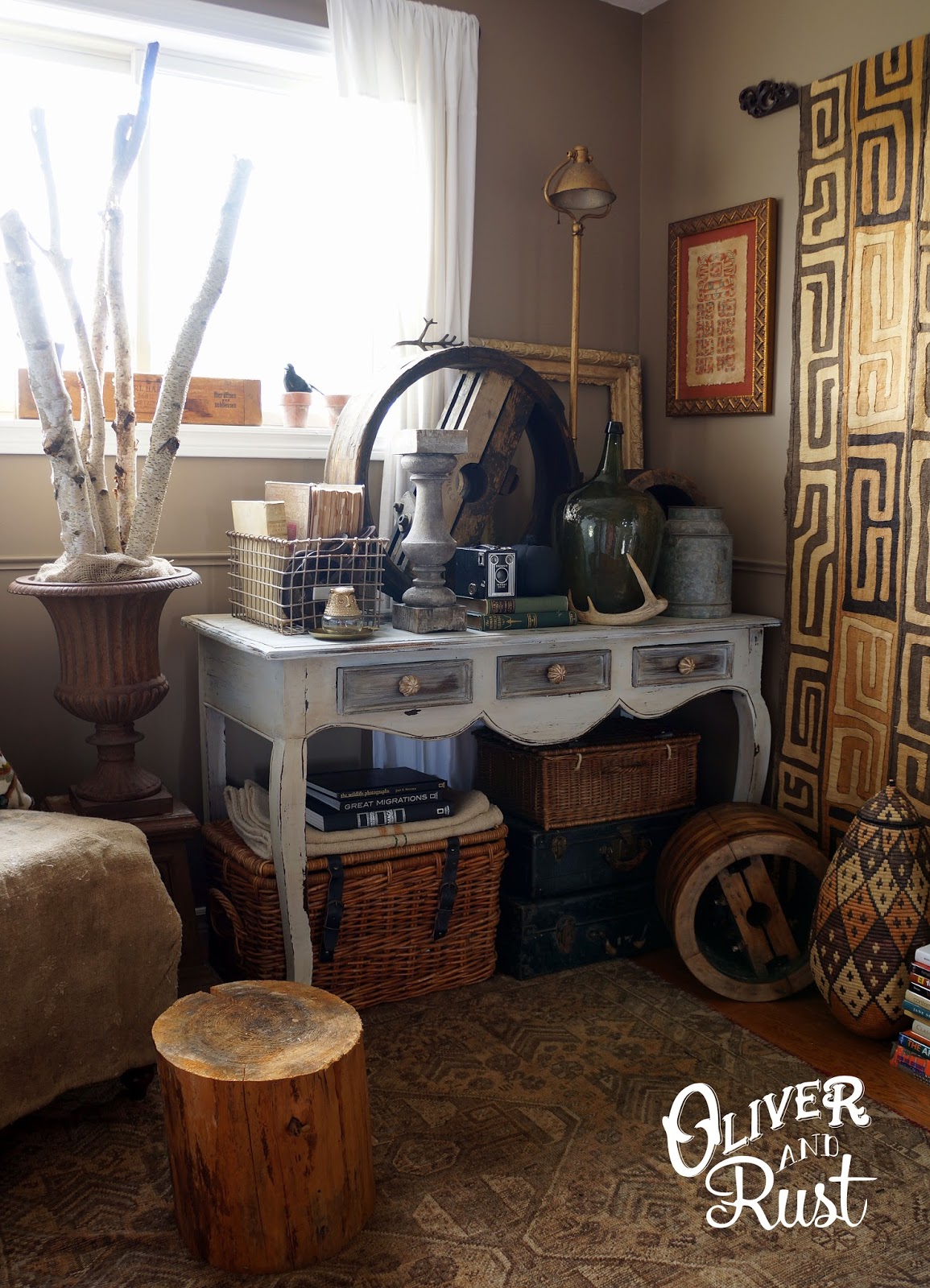 i stood upstairs staring at this hallway thinking about ways to change the position of this table and refresh the area. i moved the table over to the side and switched the chair over. i carried the urn and base up from our basement (wow that was a workout) as we needed the space for a new project down there. i think the layout worked out quite nicely.
