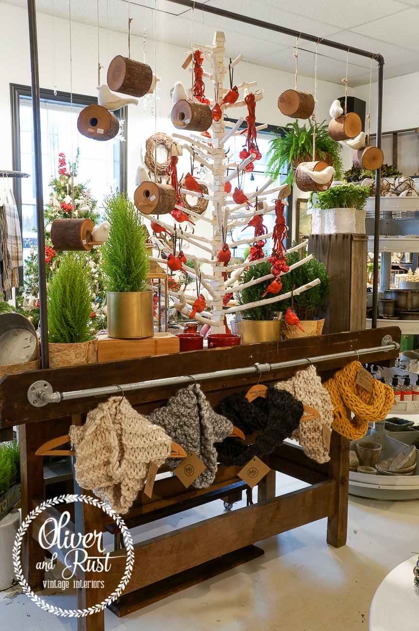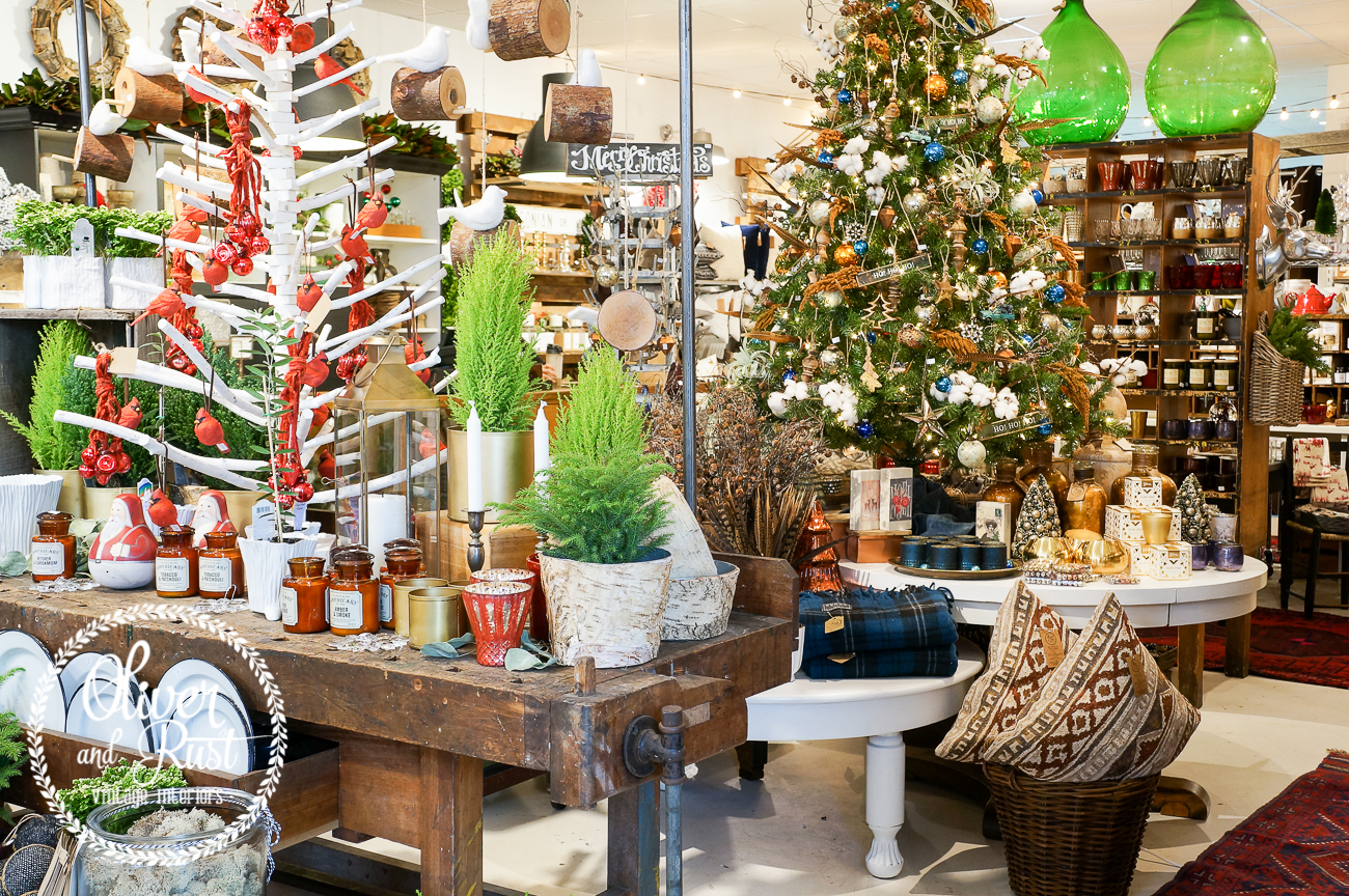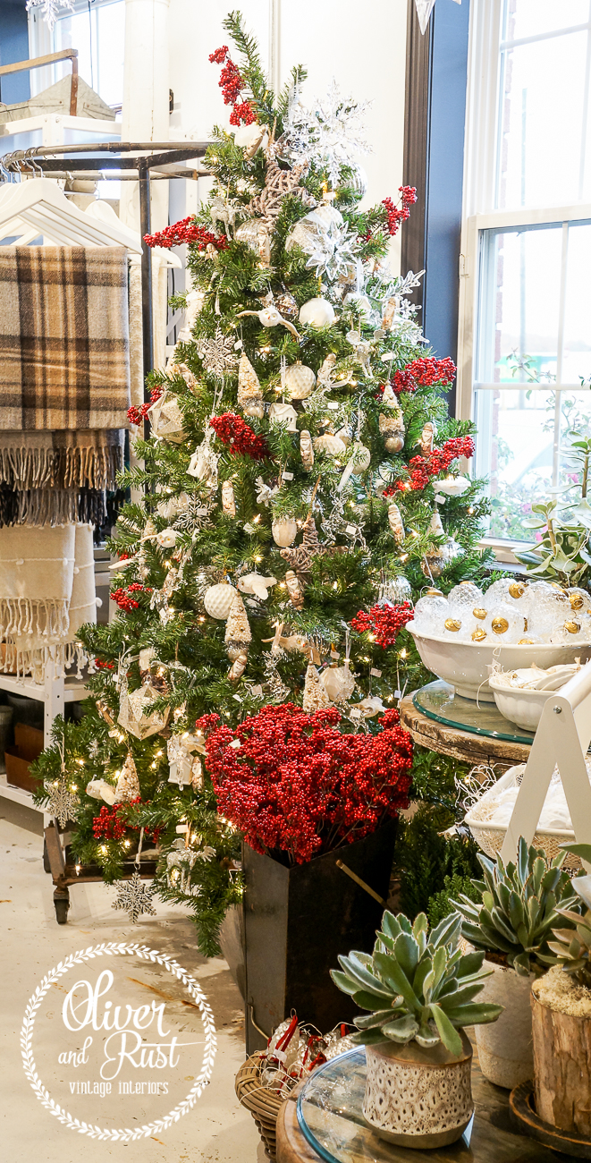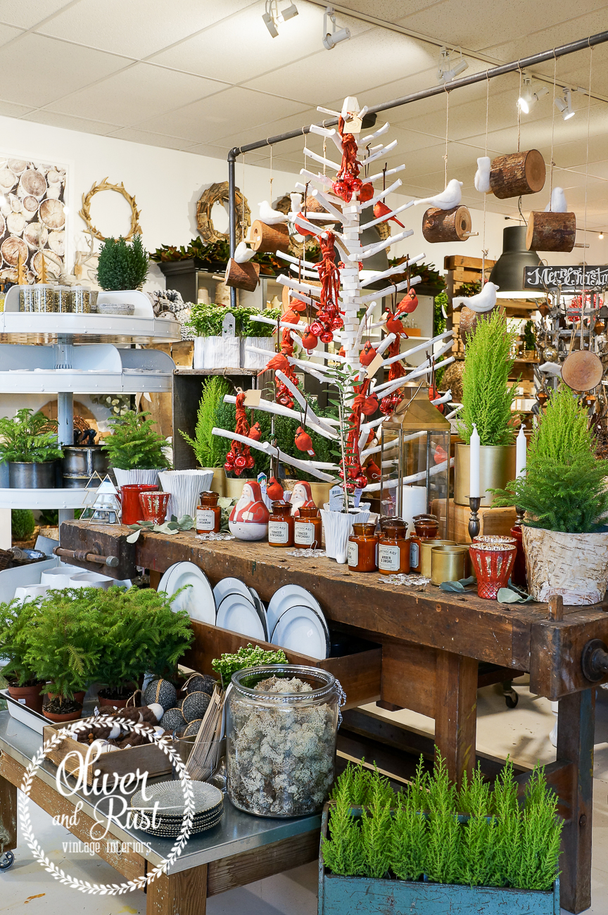 you may notice that this tree in the center of the store is not a traditional red and green. i wanted to do something just a bit different with the vintage indigo blue and copper, plus it also gives a home for some of the xerographica air plants. just don't forget to water them still if you choose this approach.