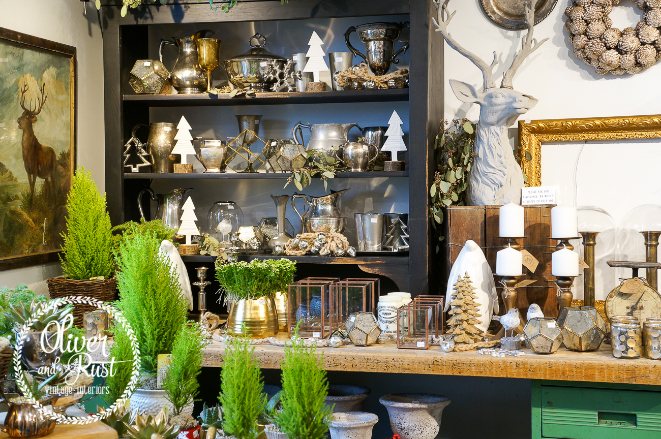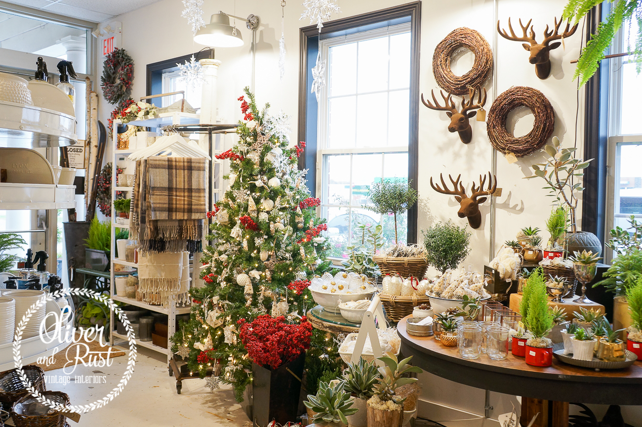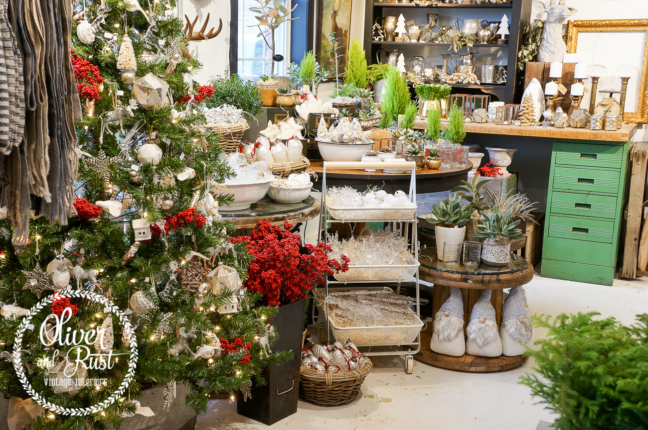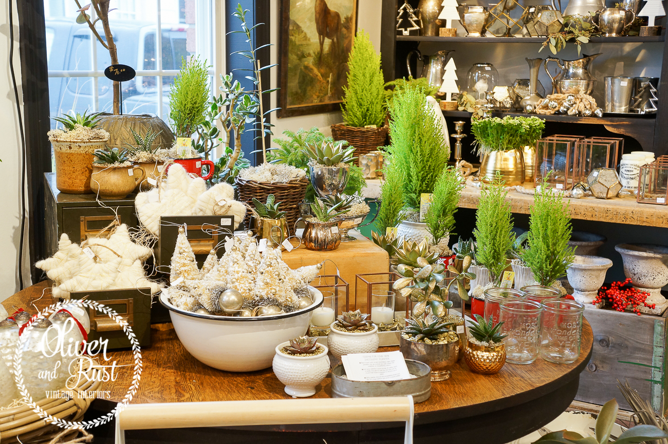 you may notice that this tree in the center of the store is not a traditional red and green. i wanted to do something just a bit different with the vintage indigo blue and copper, plus it also gives a home for some of the xerographica air plants. just don't forget to water them still if you choose this approach.