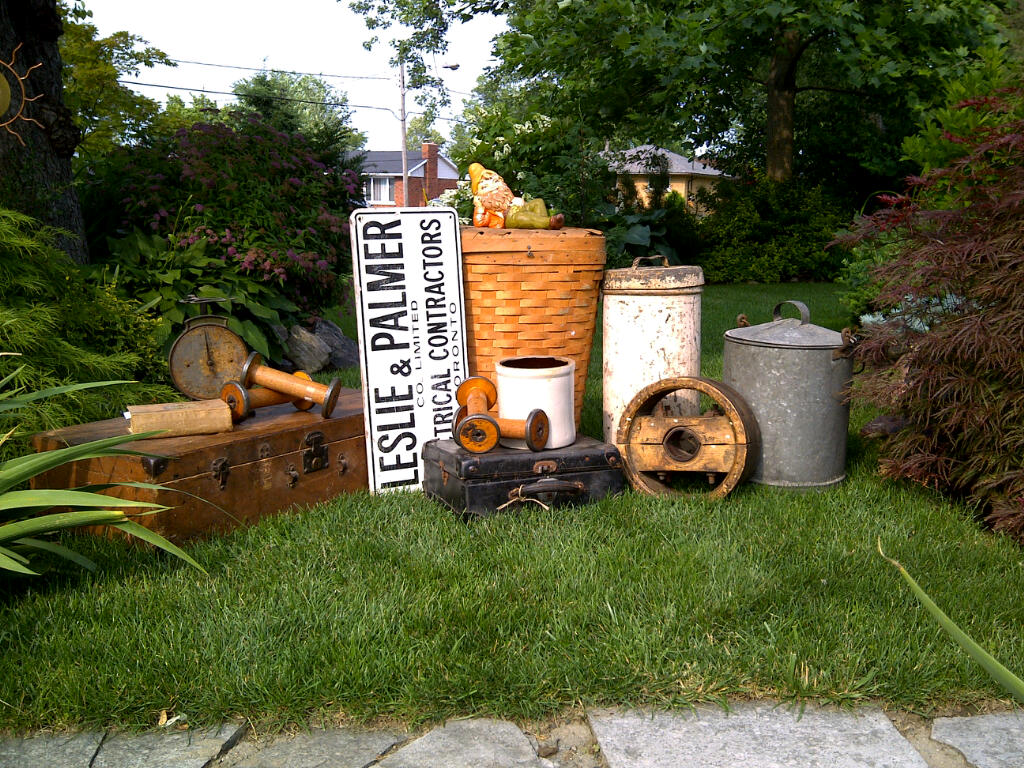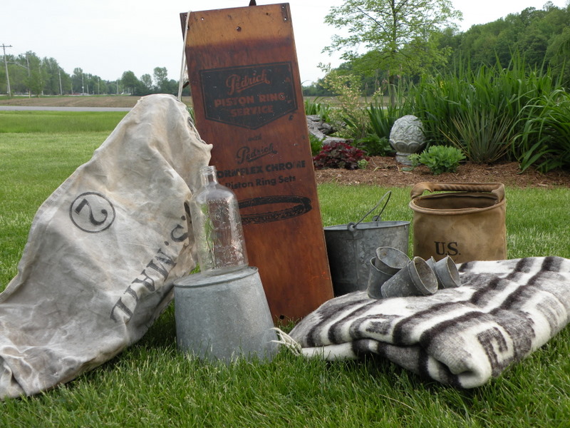 this our antique haul. I am still trying to convince my mom the wood toolbox on the bottom left doesn't look good in her house and should definitely come home with me. some amazing metal pieces, signage, and a skinny metal household scale with just the perfect amount of rust on it.