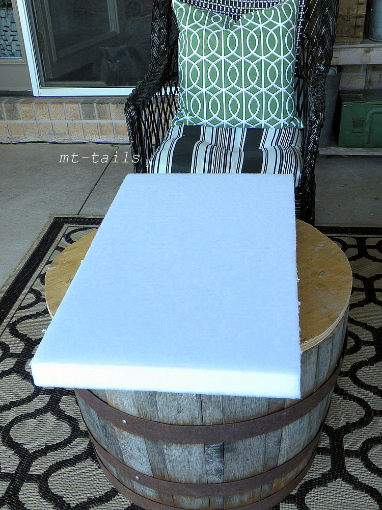 I decided to do something about that and turn our wine barrel into an upholstered ottoman.
