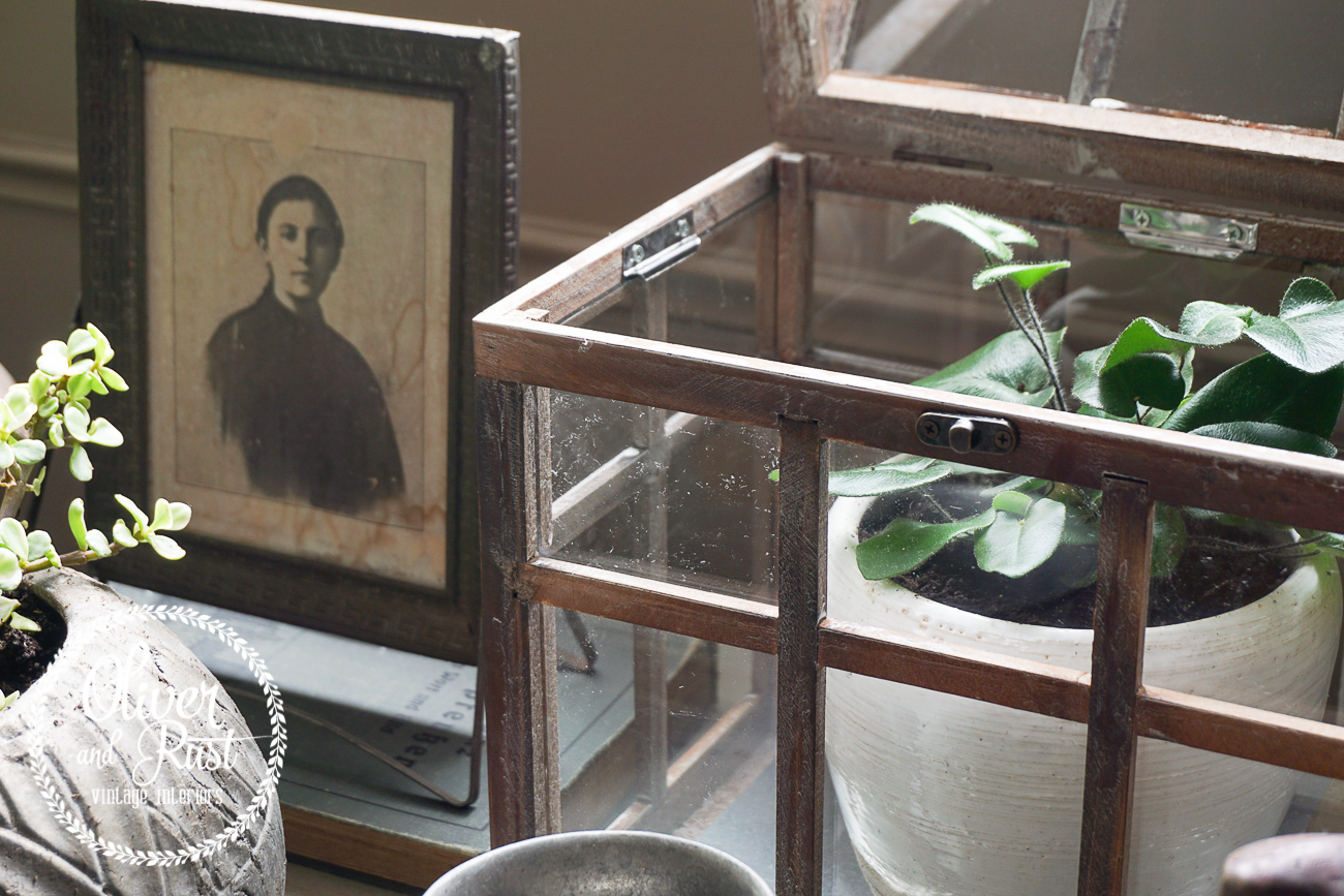 these little greenhouses and terrariums are just so much fun and so "it" right now according to the decor powers that be but, i just love the weathered wood look and the fact that it keeps the humidity going around my precious little heart fern.