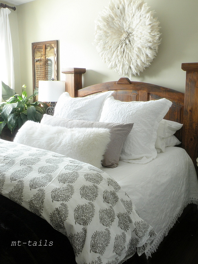 With the imminent brain stirring that keeps me from relaxing during the day, I decided to change my bed linens from the all white to a little pattern. I whipped out our West Elm paisley grey duvet coverlet, and replaced the sham on our large bolster pillow with a brown and white gingham.