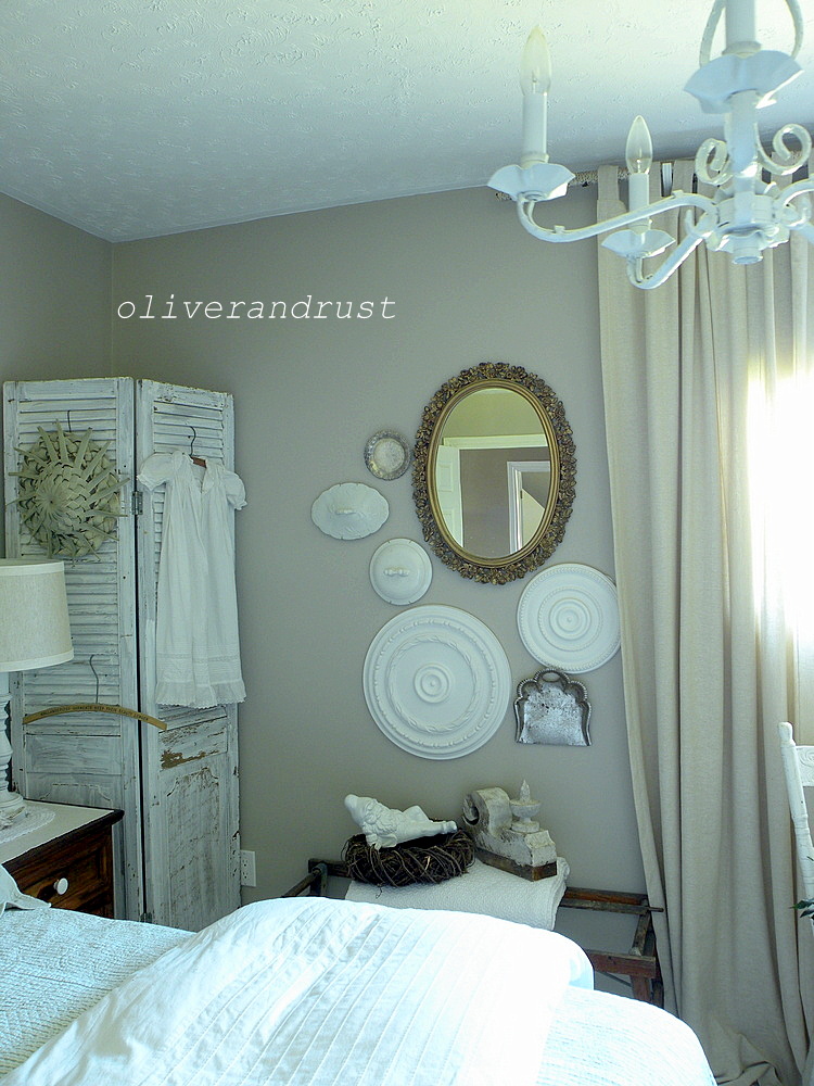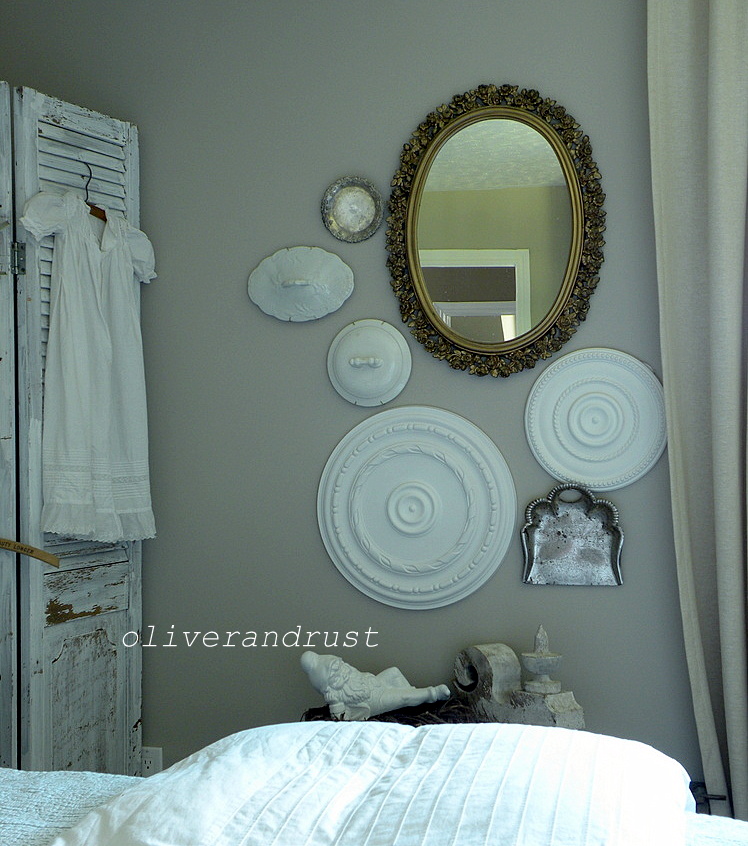 then because i was already up there mucking around, i decided to add 2 camber pot lids i to my wall of ceiling medallions. i don't really collect plates and it seems everyone has jumped on that wagon but, lost lids of peepee pots. i can do that! i accidentally ripped 1 of the medallions off the wall and was too pissed off lazy to fix it so this little gold mirror found a new home. then i got to thinking i found this silver crumber tray for 1.00 and another little silver plate. instant new vintage gallery. happy accident and i like the new look.